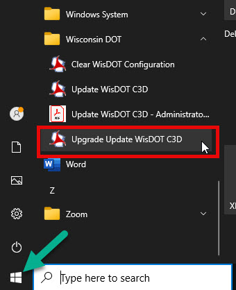 All versions of the application after the Update WisDOT Civil 3D ver 2022.6.0.6 may be upgraded without the need to uninstall the previous version. On the Windows Start menu run the Upgrade Update WisDOT C3D in the Wisconsin DOT folder. Once the upgrade is installed the Update WisDOT C3D desktop app may be used to install and update all versions of WisDOT C3D configurations for Civil 3D.