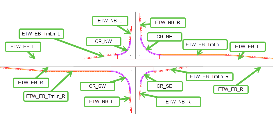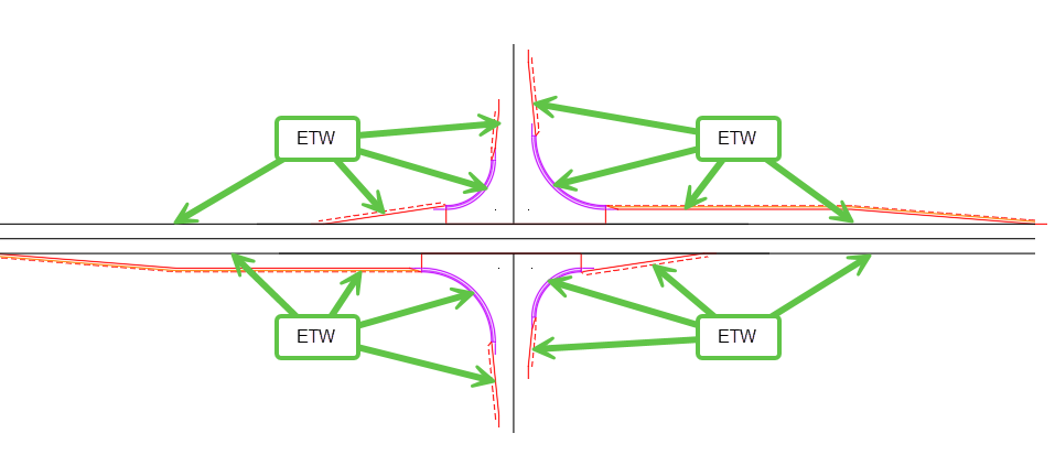 Imagine an intersection of a two-lane roadway with a two-lane roadway that has a curb returns between the two mainlines. Also imagine all the edges of pavement are coded as ETW.