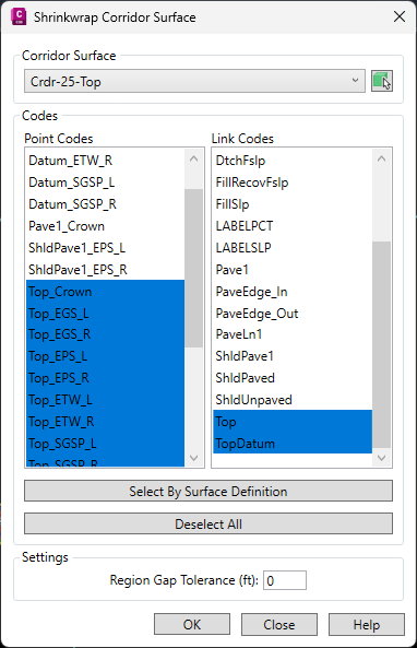This command will creates a shrink wrap boundary for the selected corridor surface based on the selected point and/or link codes. The command works by computing a separate boundary for each corridor region based on the selected point and/or link codes. Then, the final boundary is computed by merging the separate region boundaries.