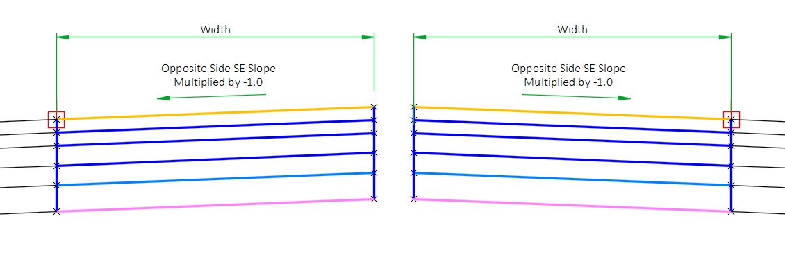 The subgrade slope is controlled by the Subgrade SE Method parameter. If Subgrade superelevation method is set to Use outside lane SE, inside lane SE, outside shoulder SE, or inside shoulder SE, the slope of the subgrade is equal to insertion side outside lane, inside lane, outside shoulder, or inside shoulder superelevation slope for the defined baseline alignment. If Subgrade superelevation method is set to Use the opposite side outside lane SE x -1, Use the opposite side inside lane SE x -1, Use opposite outside lane SE x -1, Use opposite side outside shoulder SE x -1, or Use opposite side inside shoulder SE x -1, the slope of the subgrade is equal to the opposite of insertion side outside lane, inside lane, outside shoulder, or inside shoulder superelevation slope multiplied by -1 for the defined baseline alignment. If Subgrade superelevation method is set to Follow pavement, then the subgrade slope will always be equal to the slope of the pavement surface, even if a target elevation is used to define the outer edge of the top of the travel lane. User also has the option of specifying a User defined slope.