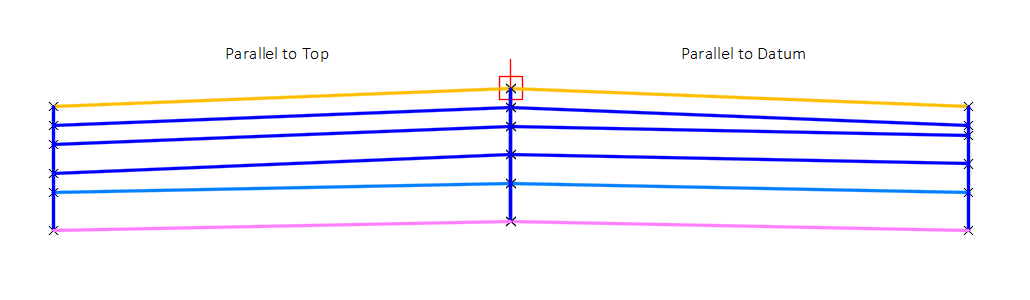 When the slope of the subgrade differs from the slope of the pavement surface, the user may use the Base layer slope orientation parameter to have all other base course layers follow the slope of the datum (subgrade) surface or follow the slope of the top (pavement) surface.