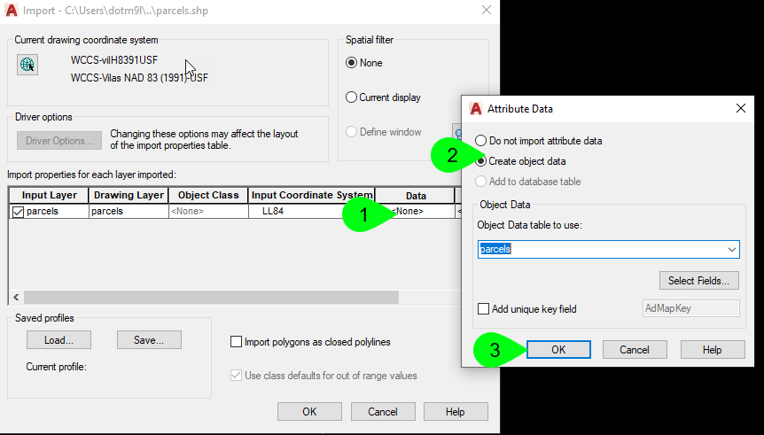 - Parcels are imported into Civil 3D as filled shapes. All attributes in the database are imported into the properties of the shape.