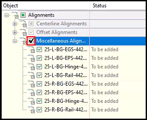 - Select alignment and pipe to target: scroll to 25-NB-L-TBT-CG-Flag-443+00 (Left) and check the box.
