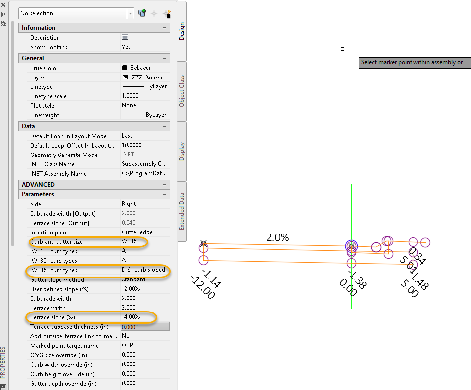 Info: This subassembly is going to start at the curb and build back toward the crown; most other assemblies start at the crown. The inside base extension will create a sub base for the curb and gutter.