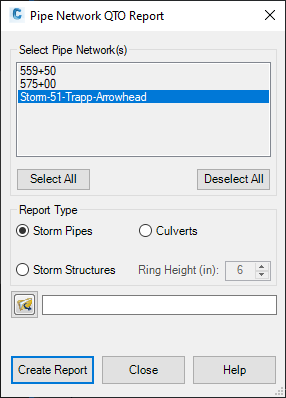 Generates the Storm Sewer Pipes Quantity report in .xlsx format. This report combines QTO functionality with pipe network data. It is intended to be used with Pipe networks created from the WisDOT custom parts lists.