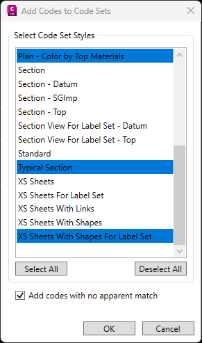 The command reads all the point, link and shape codes in a selected corridor or assembly and compares them to the selected code set style contents. The following steps occur if a code is not found in the selected code set style: