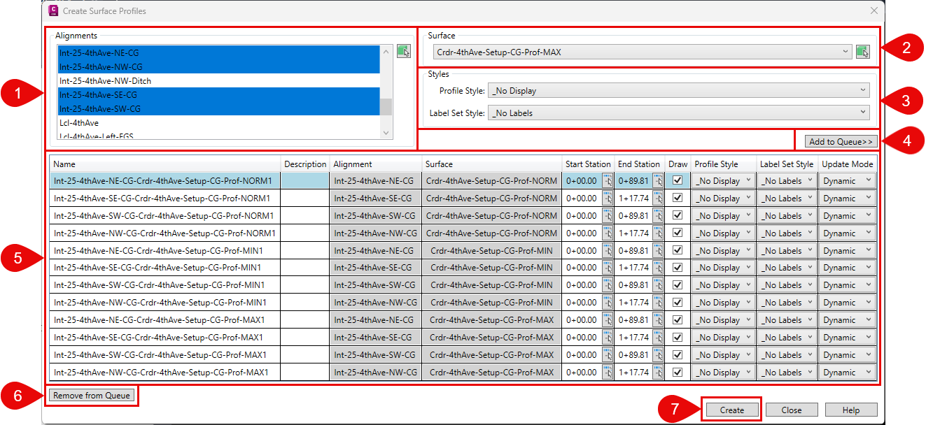 The Create Surface Profiles tool is a batch surface profile creation too. While Civil 3D does contain a native surface profile creation tool, only one alignment can be selected at a time. The Create Surface Profiles tool allows surface profiles to be created for multiple alignments at one time.