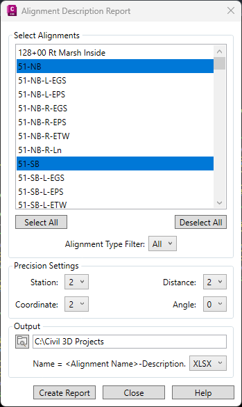 This report creates a .txt or .xlsx file containing a geometric description of one or more alignments. The report creates one file for each alignment with the file name format: <AlignmentName>-AliDesc.