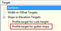 The Profile target for gutter slope can be assigned an elevation target (a profile that defines a slope as an elevation) during the corridor build process and will override any Gutter slope method parameter.