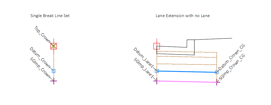 The subassembly also has a zero-pavement width option used for creating a single set of break lines along a baseline or where curb and gutter is desired without a lane. This is achieved by setting the Lane width parameter to 0. Note that in order to utilize the extended base feature for the curb and gutter, the Inside pavement thickness and Outside pavement thickness must be equal and non-zero.